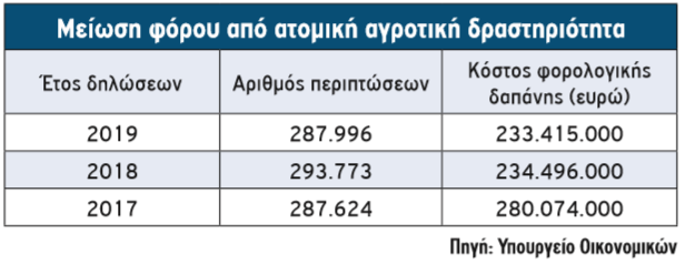 Ειδικότερα, όπως προκύπτει από την έκθεση Φορολογικών Δαπανών, η οποία βασίζεται σε στοιχεία από την εκκαθάριση φορολογικών δηλώσεων μέχρι τον Σεπτέμβριο του 2019 (φορολογικό έτος 2018), οι περιπτώσεις στις οποίες έγινε χρήση της προβλεπόμενης μείωσης φόρου για το εισόδημα από ατομική αγροτική δραστηριότητα ανήλθαν φέτος σε 287.996.