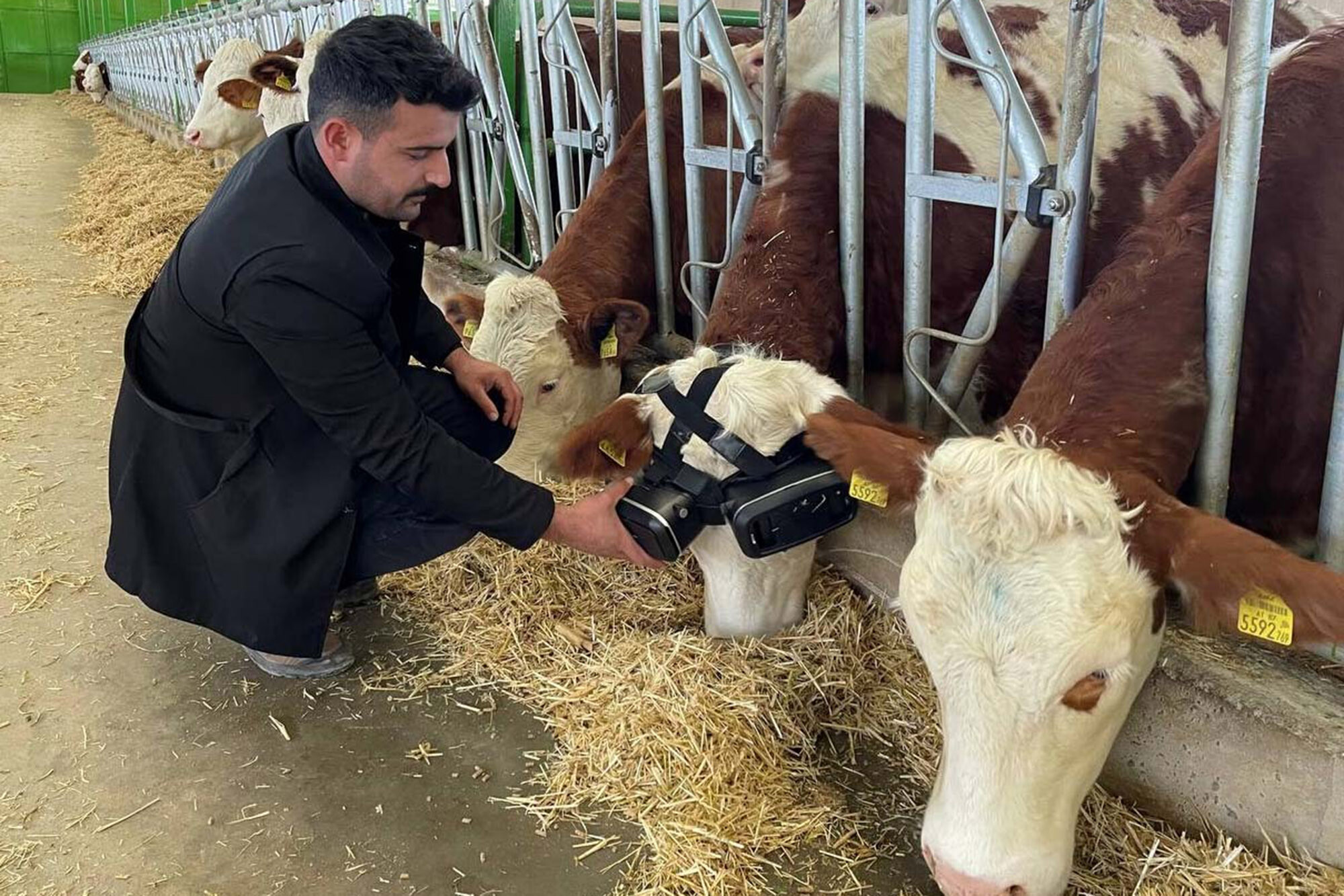 Ο Izzet Kocak έχει δοκιμάσει τις συσκευές σε δύο από τα βοοειδή του, αφού μια μελέτη έδειξε ότι ευχάριστες σκηνές κάνουν τις αγελάδες πιο χαρούμενες και παράγουν περισσότερο γάλα.