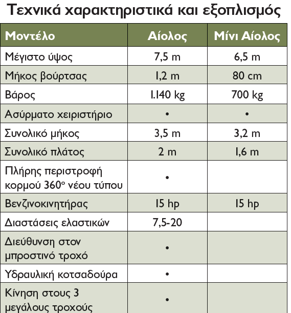 Τα µηχανήµατα «Αίολος» και «Μίνι Αίολος» έχουν ως πλεονεκτήµατα τον µεγάλο βαθµό ευελιξίας στη µετακίνηση και στη λειτουργία, τη δυνατότητα πρόσβασης παντού στο χωράφι, την εύκολη προσέγγιση στο ελαιόδεντρο και τη µικρή ισχύ των κινητήρων, επιτυγχάνοντας χαµηλό κόστος λειτουργίας και, κατά συνέπεια, χαµηλό περιβαλλοντικό αποτύπωµα. Η κίνησή τους γίνεται µε διαφορικό στον πίσω άξονα.