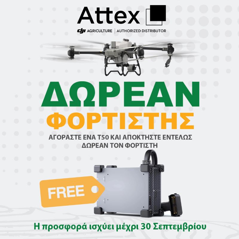 Η Attex, επίσημος διανομέας της DJI Agriculture στην Ελλάδα, είναι στην ευχάριστη θέση να παρουσιάσει μία αξεπέραστη καλοκαιρινή προσφορά για το ψεκαστικό drone DJI Agras T50. Από 1 Ιουλίου έως 30 Σεπτεμβρίου 2025, με κάθε νέα αγορά και ενεργοποίηση ενός Agras T50 παίρνετε τον φορτιστή DJI C10000 δωρεάν, κάνοντάς το πιο προηγμένο ψεκαστικό drone πιο προσιτό από ποτέ, μειώνοντας δραστικά το χρόνο ψεκασμού.