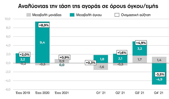 Aντίστοιχα, και το +5,3% που καταγράφηκε στο κανάλι του Cash & Carry έχει να κάνει και με την πολύ χαμηλή επίδοση του 2020, καθώς η λειτουργία των καταστημάτων που τροφοδοτούσε γινόταν, λόγω κορωνοϊού, μετ’ εμποδίων. Κατ’ ουσίαν, βέβαια, ο τζίρος και των δύο καναλιών επέστρεψε στα επίπεδα του 2019. Στην ουσία, βέβαια, ο τζίρος επέστρεψε και στις δύο περιπτώσεις στο 2019.