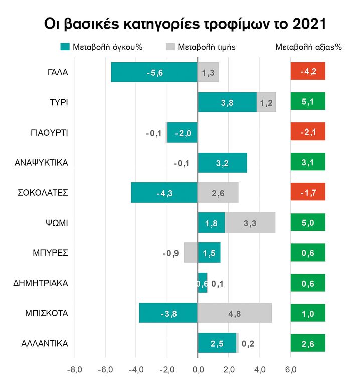 Ανά κατηγορία καταστημάτων, για άλλη μια χρονιά, πρωταθλήτριες αναδείχθηκαν οι μεγάλες αίθουσες (hypermarkets), οι οποίες έτρεξαν με 8,1% και, όπως επισημαίνουν οι αναλυτές της NielsenIQ, διατηρούν το μομέντουμ και το 2022.