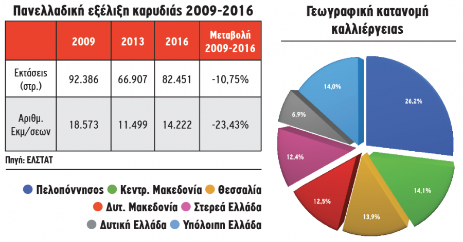 Σημαντική κατηγορία δενδρώδους καλλιέργειας με αναπτυξιακή πορεία τα τελευταία χρόνια αποτελεί αυτή των ακρόδρυων. Η «ΥΧ» παρουσιάζει την εξέλιξη τεσσάρων βασικών καλλιεργειών (καρύδι, αμύγδαλο, κάστανο και φιστίκι) για την περίοδο 2009-2016, σύμφωνα με στοιχεία που ελήφθησαν από την ΕΛΣΤΑΤ. Ενδεικτικό της δυναμικής των καλλιεργειών, καθώς και του μεγάλου ενδιαφέροντος που συγκεντρώνουν στις τάξεις των παραγωγών, είναι ότι σε ορισμένες βασικές παραγωγικές περιοχές της χώρας, τα ακρόδρυα όχι μόνο επανέκαμψαν, αλλά παρουσίασαν και αύξηση στρεμμάτων σε σχέση με το 2009. Ακόμα όμως και στην περίοδο της βαθιάς ύφεσης (2009-2013), αποτέλεσαν πολύτιμη λύση για αρκετούς παραγωγούς. Αξίζει να σημειωθεί ότι, σύμφωνα με τα στοιχεία, την περίοδο 2009-2016 ο αριθμός των εκμεταλλεύσεων μειώθηκε σημαντικά και στις τέσσερις καλλιέργειες, ιδιαίτερα δε σε αμυγδαλιές (-21,5%) και σε καρυδιές (-23,4%). Σε συνδυασμό μάλιστα με την εξέλιξη των εκτάσεων (-1% και -10,7% αντίστοιχα) φαίνεται ότι υπήρξε μια αξιοσημείωτη αύξηση στο μέγεθος των εκμεταλλεύσεων το οποίο ωστόσο συνήθως περιορίζεται στη ζώνη των 10 στρεμμάτων.