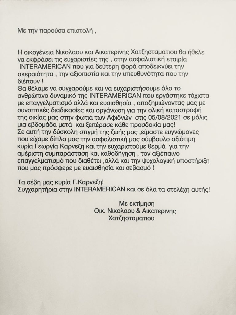 Είναι χαρακτηριστικό ότι για τις πυρκαγιές του Αυγούστου πληρώθηκαν εντός του μήνα 500.000 ευρώ, με την πρώτη αποζημίωση (145.000 ευρώ) να καταβάλλεται για κατοικία την τρίτη ημέρα από την καταστροφή της. Η πληγείσα οικογένεια Ν. Χατζησταματίου εκφράζει δημόσια τις ευχαριστίες της για την αμεσότητα και την ταχύτητα έκδοσης της αποζημίωσης, υπογραμμίζοντας σε επιστολή της την αξιοπιστία και υπευθυνότητα της INTERAMERICAN, καθώς και την επαγγελματική συνέπεια της ασφαλιστικής συμβούλου Γ. Καρνέζη, που συνέτρεξε από την πρώτη στιγμή.