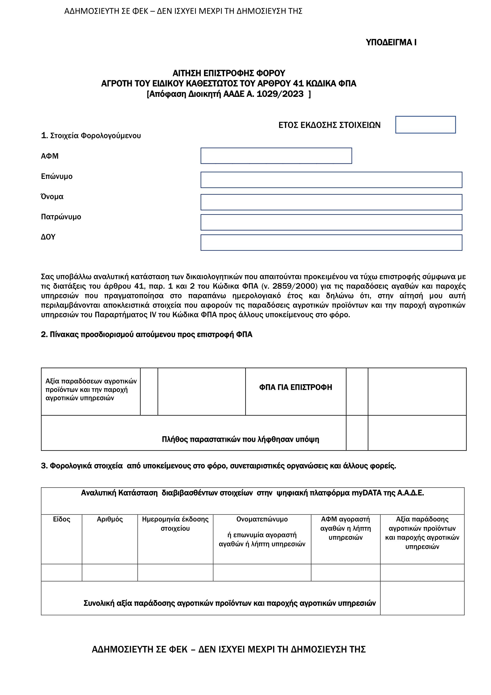 Κατά παρέκκλιση, η δήλωση – αίτηση επιστροφής υποβάλλεται εντός της προαναφερθείσας προθεσμίας στην αρμόδια Δ.Ο.Υ. για τη φορολογία εισοδήματος του αιτούντος αγρότη του ειδικού καθεστώτος, ψηφιακά μέσω της εφαρμογής Ψηφιακής Υποδοχής και Διαχείρισης Αιτημάτων της ΑΑΔΕ «Τα αιτήματά μου», η οποία είναι διαθέσιμη μέσω της ψηφιακής πύλης «myAADE» (myaade.gov. gr), με χρήση του εντύπου «ΦΠΑ 304 Δήλωση – Αίτηση και Αναλυτική Κατάσταση Δικαιολογητικών για την επιστροφή του ΦΠΑ στους αγρότες του ειδικού καθεστώτος του άρθρου 41 του Κώδικα ΦΠΑ», στις εξής περιπτώσεις περιοριστικά: