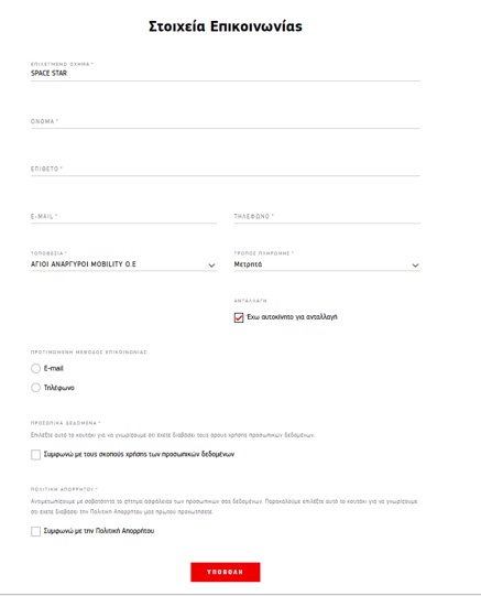 Επιλέγοντας το ‘Αγοράστε ONLINE’ ο πελάτης μεταφέρεται σε μια φόρμα συμπλήρωσης στοιχείων επικοινωνίας παρόμοια με αυτή των test drive. Στην φόρμα δίνονται επιπλέον οι επιλογές ώστε να δηλώσει τον τρόπο επιθυμητής πληρωμής και εάν υπάρχει αυτοκίνητο για ανταλλαγή:
