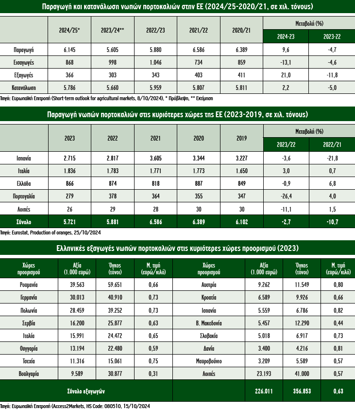 Η παραγωγή νωπών πορτοκαλιών στην ΕΕ, σύμφωνα με τις τελευταίες προβλέψεις της Ευρωπαϊκής Επιτροπής, μετά τη μείωση της περιόδου 2023/24, αναμένεται να ανακάμψει, ανερχόμενη την περίοδο 2024/25 σε 6.145 χιλ. τόνους (+9,6%). Η ανάκαμψη θα προέλθει από την άνοδο της παραγωγής του προϊόντος στην Ισπανία, τη μεγαλύτερη παραγωγό χώρα πορτοκαλιών στην ΕΕ, ενώ άνοδος αναμένεται και στην Πορτογαλία, μετά την έντονη μείωσή της κατά την προηγούμενη περίοδο.