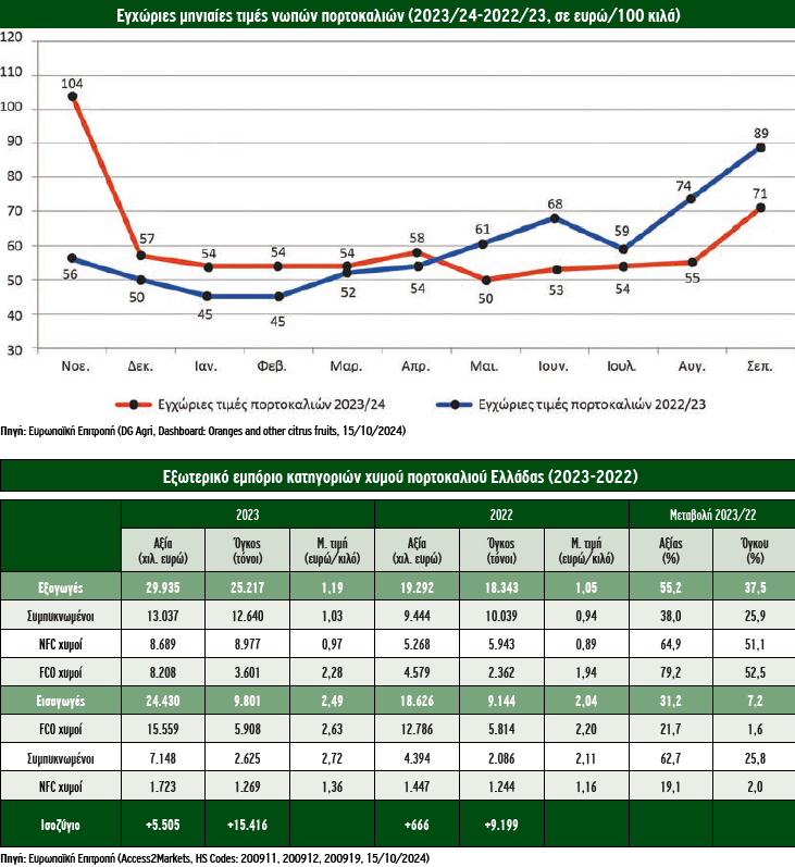 Πέραν αυτών όμως, η εγχώρια μηνιαία τιμή νωπών πορτοκαλιών καταγράφει πτωτική πορεία στο τέλος της περιόδου 2023/24 σε σύγκριση με την προηγούμενη. Όπως προκύπτει από πρόσφατες εκτιμήσεις (στοιχεία Ευρωπαϊκής Επιτροπής, 15/10/2024), η τιμή του προϊόντος, έξω από το συσκευαστήριο, αν και ξεκίνησε από υψηλό επίπεδο τον Νοέμβριο του 2023 (104 ευρώ/100 κιλά), παρουσίασε απότομη πτώση στη συνέχεια, ενώ στο διάστημα από τον Μάιο έως και τον Σεπτέμβριο του 2024 κυμάνθηκε σε επίπεδο αισθητά χαμηλότερο από το αντίστοιχο του προηγούμενου έτους. Σημειώνεται χαρακτηριστικά ότι τον Σεπτέμβριο του 2024, η μέση εγχώρια μηνιαία τιμή νωπών πορτοκαλιών, αν και ανήλθε σε 71 ευρώ/100 κιλά, ήταν σημαντικά μικρότερη από τον αντίστοιχο μήνα του 2023 (89 ευρώ/100 κιλά).
