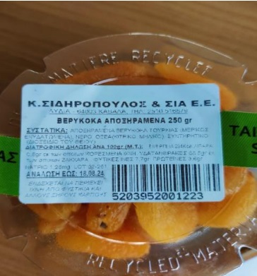 Ο Ενιαίος Φορέας Ελέγχου Τροφίμων (ΕΦΕΤ) και συγκεκριμένα η Περιφερειακή Διεύθυνση Ανατολικής Μακεδονίας & Θράκης κατά τη διενέργεια ελέγχων στο πλαίσιο του Προγράμματος επισήμου ελέγχου έτους 2023, για τον έλεγχο προσθέτων τροφίμων και αρωματικών ουσιών σε διάφορα είδη τροφίμων, προέβη σε δειγματοληψία τροφίμου με στοιχεία «ΒΕΡΥΚΟΚΑ ΑΠΟΞΗΡΑΜΕΝΑ» σε πλαστική κλειστή συσκευασία 250γρ, με αριθμό παρτίδας 02-251 και ανάλωση έως: 18/08/2024, που συσκευάζεται από την επιχείρηση «ΚΑΡΠΟΣ» Σιδηρόπουλος Κ. & ΣΙΑ Ε.Ε., με έδρα τη Λυδία Ν. Καβάλας.