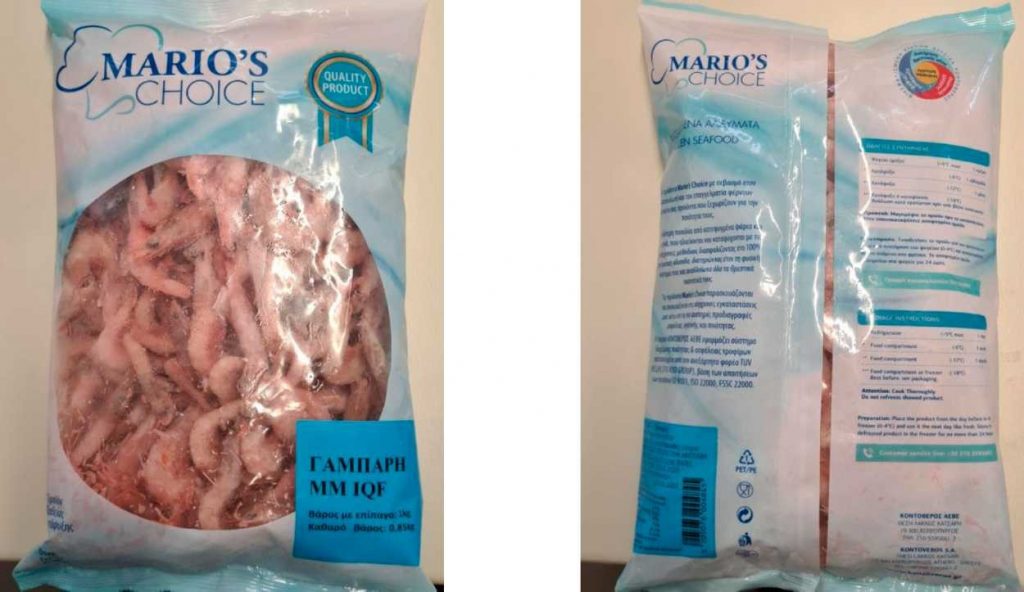 Ο Ε.Φ.Ε.Τ. και συγκεκριμένα η Περιφερειακή Διεύθυνση Αττικής, κατά τη διενέργεια ελέγχων στο πλαίσιο του Προγράμματος «Επίσημος Έλεγχος για την παρακολούθηση των επιπέδων των προσθέτων τροφίμων σε αλιεύματα» έτους 2021, προέβη σε δειγματοληψία τροφίμου με τα στοιχεία: “MARIO’S CHOICE, ΓΑΜΠΑΡΗ ΑΙΓΑΙΟΥ ΜΜ IQF”, με αριθμό παρτίδας 210113001 και ημερομηνία ανάλωσης 23/11/22, βάρους με επίπαγο 1000γρ και καθ. βάρους 850 γρ., το οποίο παράγεται από την εταιρεία «ΚΟΝΤΟΒΕΡΟΣ ΑΕΒΕ.» με έδρα στον Ασπρόπυργο Αττικής.