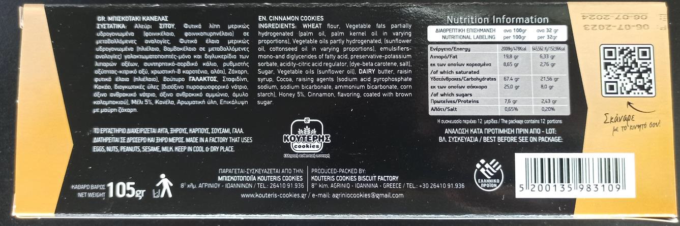 Ο Ε.Φ.Ε.Τ. και ειδικότερα η Περιφερειακή Διεύθυνση Δυτικής Ελλάδας, στο πλαίσιο του Προγράμματος «Επίσημος Έλεγχος για την Παρακολούθηση των Επιπέδων Προσθέτων Τροφίμων και Αρωματικών Ουσιών σε Τρόφιμα», προέβη σε δειγματοληψία τροφίμου με τα στοιχεία: «KORONA COOKIES-Μπισκότα κανέλας με μέλι και μαύρη ζάχαρη» 105gr, ημ/νία Λήξεως 06/07/2024, ημ/νία Παραγωγής: 06/07/2023), που παράγεται από την εταιρεία «Μπισκοτοποιία Kouteris Cookies».
