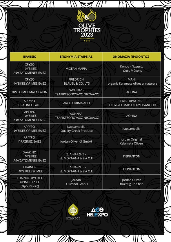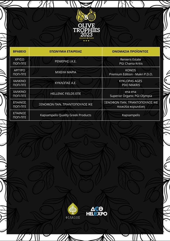 Ανακοινώθηκαν οι νικητές του διαγωνισμού ελαιολάδου και επιτραπέζιας ελιάς «OLIVE TROPHIES 2023»