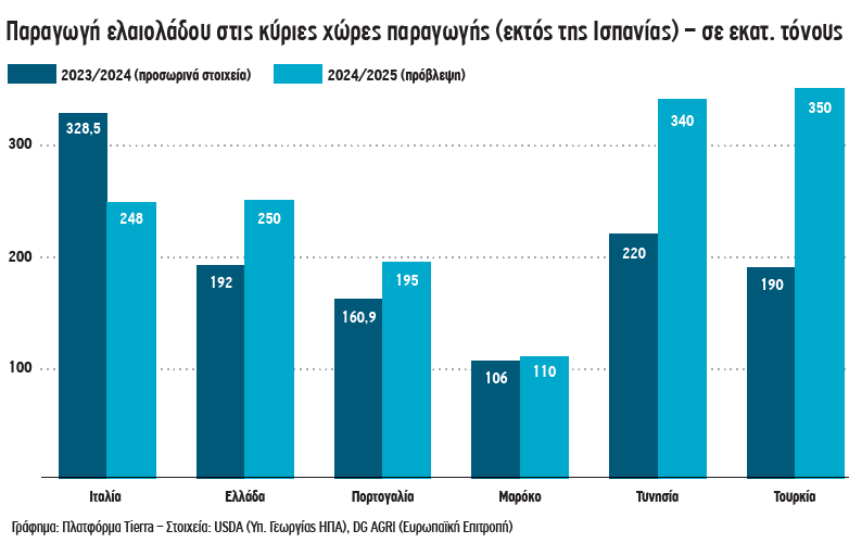 Στο υπόλοιπο μεσογειακό τόξο, η βελτίωση είναι, επίσης, εμφανής. Χώρες όπως η Ελλάδα, η Πορτογαλία, το Μαρόκο, η Τυνησία και η Τουρκία (εξαιρουμένης της Ισπανίας) αύξησαν την παραγωγή τους κατά 1,5 εκατ. τόνους ή 24,7% περισσότερους από το προηγούμενο έτος. Το μεγαλύτερο μέρος της αύξησης προέρχεται από χώρες εκτός ΕΕ, όπως η Τουρκία, η οποία σχεδόν διπλασίασε την παραγωγή της (+84%) και η Τυνησία, η οποία έφτασε τους 340.000 τόνους (+54,5%). Αντίθετα, η Ιταλία αποτέλεσε την εξαίρεση με πτώση 24,5%.