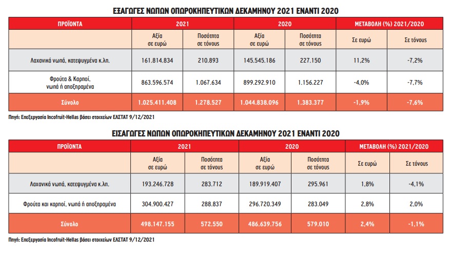 Σημειώνεται με ιδιαίτερη έμφαση ότι σε πολλά φρούτα η μεσοσταθμική τιμή πώλησης ανά μονάδα βάρους ήταν εντυπωσιακά αυξημένη και συγκεκριμένα σε ροδάκινα (32%), ακτινίδια (16%), φράουλες (33%), νεκταρίνια (26%), αγγούρια (13%) και ντομάτες (18%). Παράλληλα, το δεκάμηνο 2021 σημειώθηκε μείωση των εισαγωγών στη χώρα μας κατά -1,1% σε όγκο σε συνέχεια της -9,1% μείωσης του 2020.