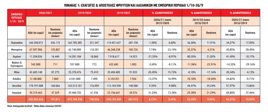 Παρά ταύτα η πρόβλεψη στο κλείσιμο του έτους είναι ότι θα έχουμε μια αύξηση της αξίας των εξαγωγών μας με παράλληλη μείωση της τάξεως του όγκου 6% και αυτό με αύξηση της μεσοσταθμικής τιμής μονάδας. Οι εξαγωγές των νωπών φρούτων και λαχανικών κατά την εμπορική περίοδο 2020/2021 ολοκληρώθηκαν τον Σεπτέμβριο και παρουσιάζονται αυξημένες στον όγκο τους +5,44 έναντι της αντίστοιχης περιόδου 2019/2020 και +9,96% του 2018/2019, αλλά και στην αξία τους κατά +6,72% έναντι 2019/2020 σε συνέχεια +35,28%. Αυτό σημαίνει αυξημένη τιμή μονάδας την περίοδο 2020/2021 σε σχέση με την προ πανδημίας περίοδο 2018/2019 κατά +24,5%, οφειλόμενη σε μεγάλη ζήτηση αφενός προϊόντων που περιέχουν βιταμίνη C και αφετέρου προϊόντων με μεγάλη αποθήκευση (βλ. Πίνακα 1).