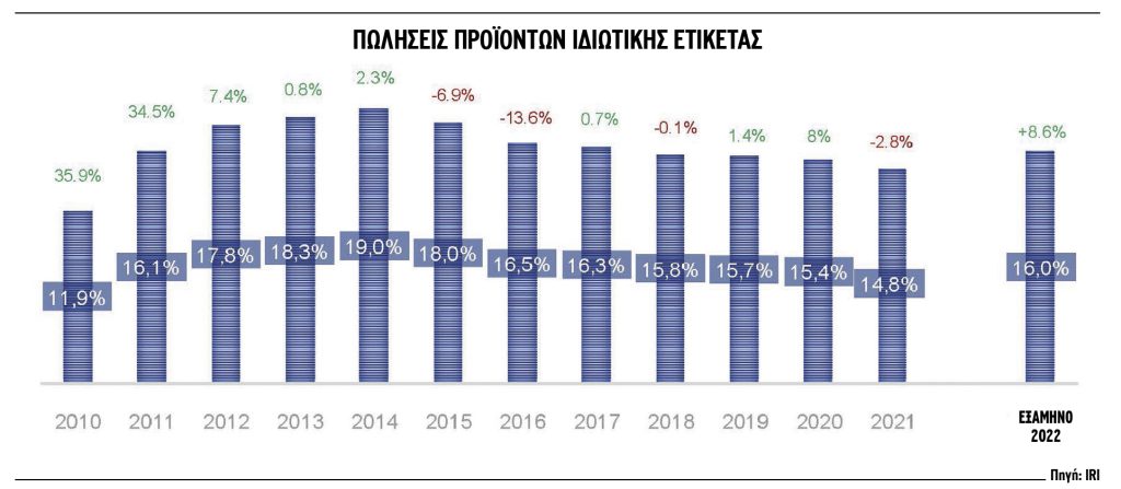 Λαμβάνοντας υπόψη τα παραπάνω, δεν προκαλεί έκπληξη το γεγονός ότι το μερίδιο των προϊόντων ιδιωτικής ετικέτας (private label) εμφανίζεται στο εξάμηνο αυξημένο κατά 8,6% στο 16%. Πρόκειται για τάση που είχε αποτυπωθεί τόσο στα στοιχεία της Nielsen για το πεντάμηνο του 2022, όσο και σε σχετικές έρευνες του ΙΕΛΚΑ. Από τα νεότερα στοιχεία της IRI μοιάζει να επιβεβαιώνεται η εκτίμηση ότι, εφόσον δεν ανακοπεί το τρέχον κύμα ανατιμήσεων, η ιδιωτική ετικέτα θα κλείσει το 2022 με αυξημένο μερίδιο αγοράς, ύστερα από το πτωτικό σερί των τελευταίων ετών. Σημειωτέον ότι, σύμφωνα με τα στοιχεία της IRI, τα private label προϊόντα κατείχαν το 2014 μερίδιο 19%, το οποίο έκτοτε υποχωρούσε κάθε χρόνο, έστω και οριακά, φτάνοντας πέρυσι το 14,8%.