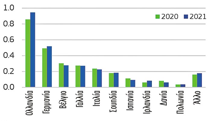 Από το σύνολο των εισαγωγών βιολογικών προϊόντων της ΕΕ, το 33%, δηλαδή 945.000 τόνοι, φτάνει στην Ολλανδία (+10,2% το 2021 σε σχέση με το 2020) και το 20%, 517.000 τόνοι, στη Γερμανία (+5,2% το 2021 σε σχέση με το 2020).