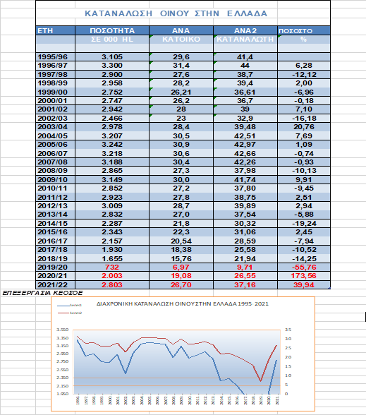 Δεδομένης της αρνητικής επίδρασης της πανδημίας, η κατανάλωση οίνου 2021/2022, παρουσιάζει αύξηση κατά 65,32% σε σύγκριση με το μέσο όρο της προηγούμενης 5ετίας και κατά 28,16% σε σύγκριση με το μέσο όρο της προηγούμενης 10ετίας.