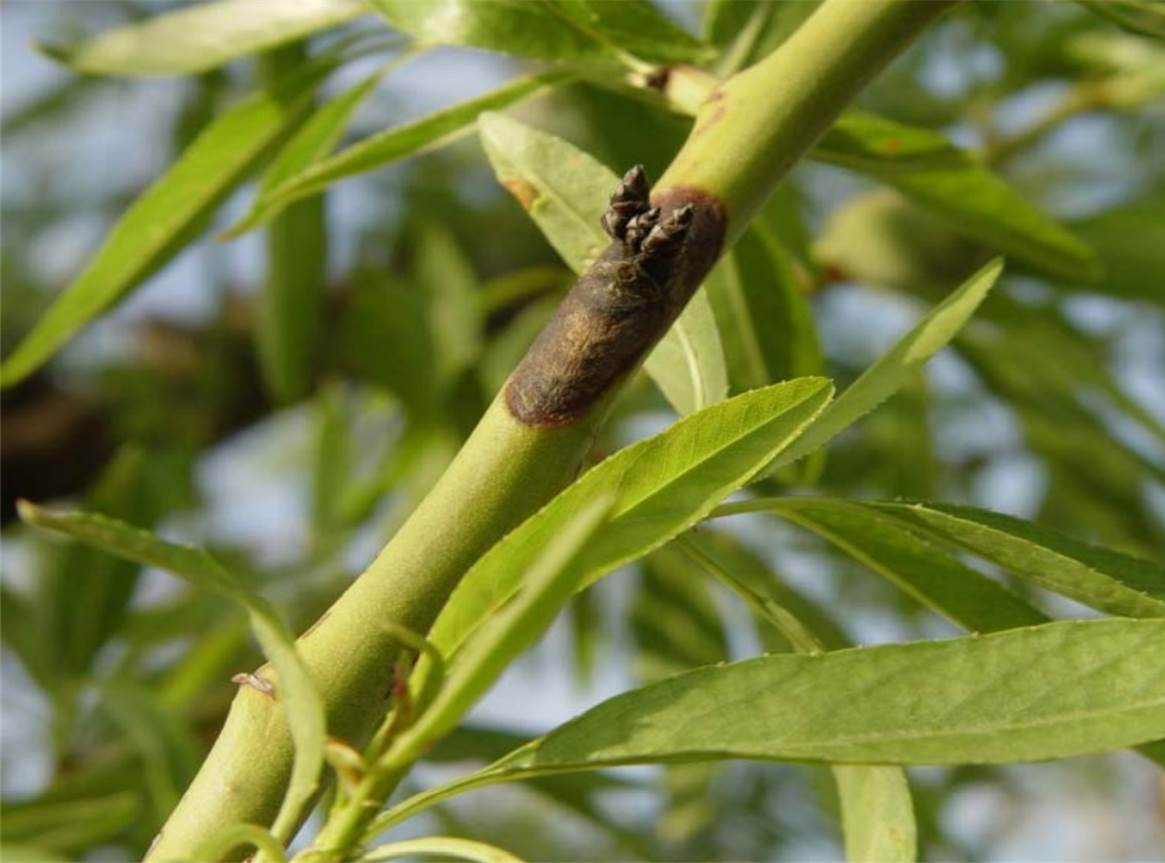 Τα σπουδαιότερα συμπτώματα εμφανίζονται κατά κανόνα στην βάση των ετήσιων κλαδίσκων. Παρατηρούνται βυθισμένα τεφροκάστανα, μέχρι καστανά έλκη με μελανά μικροσκοπικά στίγματα και διακρίνεται έκκριση κόμμεος κυρίως γύρω από τους οφθαλμούς (εικόνα 1).