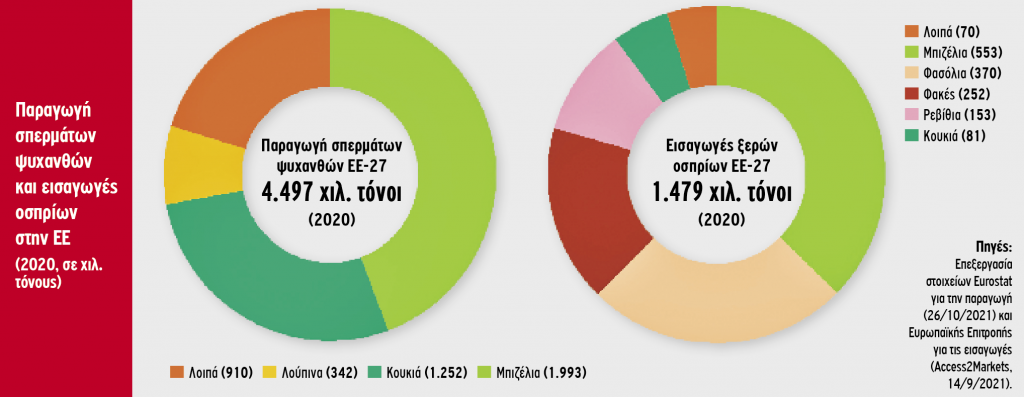 Στην ΕΕ, η παραγωγή σπερμάτων πρωτεϊνούχων ψυχανθών παρουσίασε άνοδο το 2020, εκτιμώμενη σε 4,5 εκατ. τόνους περίπου, μέγεθος αισθητά αυξημένο ως προς το προηγούμενο έτος (+12%). Τον μεγαλύτερο όγκο καταλαμβάνουν τα μπιζέλια (44% το 2020) που χρησιμοποιούνται κυρίως ως ζωοτροφή, με όγκο 2 εκατ. τόνων περίπου και ακολουθούν τα κουκιά και τα λούπινα. Σημαντική επίσης θεωρείται η παραγωγή στα λοιπά προϊόντα (910.000 τόνοι), ο όγκος των οποίων ανέκαμψε (+22%) μετά την πτώση του 2019, όπου περιλαμβάνονται τα σπέρματα βίκου, καλλιέργεια που αναπτύσσεται κυρίως σε μεσογειακές χώρες ως ζωοτροφή, καθώς και τα όσπρια (μπιζέλια, φασόλια, φακές, ρεβίθια, κουκιά κ.ά.). Πέντε χώρες (Γαλλία, Γερμανία, Πολωνία, Ισπανία και Λιθουανία) καλύπτουν το μεγαλύτερο μέρος της συνολικής παραγωγής σπερμάτων ψυχανθών (68%), ενώ στα λοιπά προϊόντα κυριαρχούν η Ισπανία, η Πολωνία και η Ελλάδα (74%).