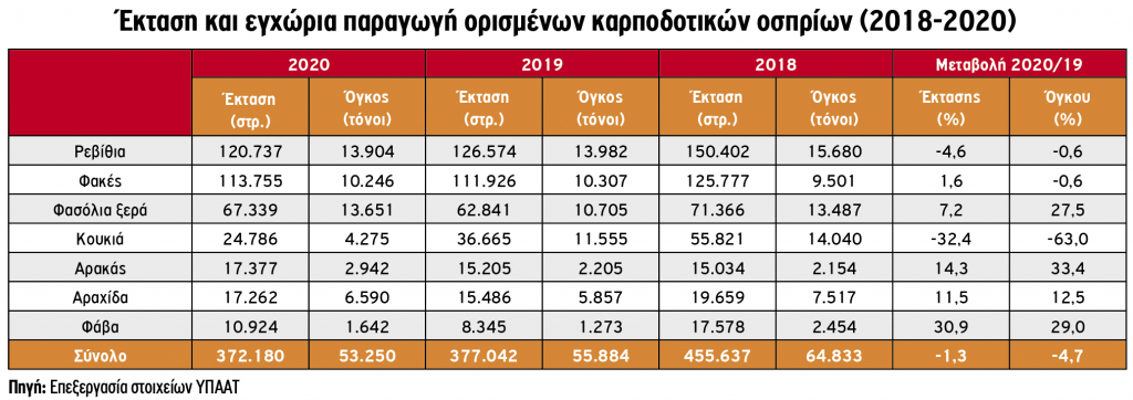 Οριακή επίσης ήταν η μεταβολή στις φακές, με όγκο 10.240 τόνων, ενώ έντονη ήταν η μείωση στα κουκιά (-63%), σε συνέχεια εκείνης του 2018. Αντίθετα, σημαντική άνοδο σημείωσε η παραγωγή στα ξερά φασόλια (+27%), στον αρακά (+33%) και στη φάβα (+29%) και μικρότερη στην αραχίδα (+12%), προϊόν από το οποίο παράγονται τα αράπικα φιστίκια. Στο σύνολο των αναφερόμενων προϊόντων, η εγχώρια παραγωγή περιορίστηκε το 2020 σε 53.250 τόνους (-4,7%).