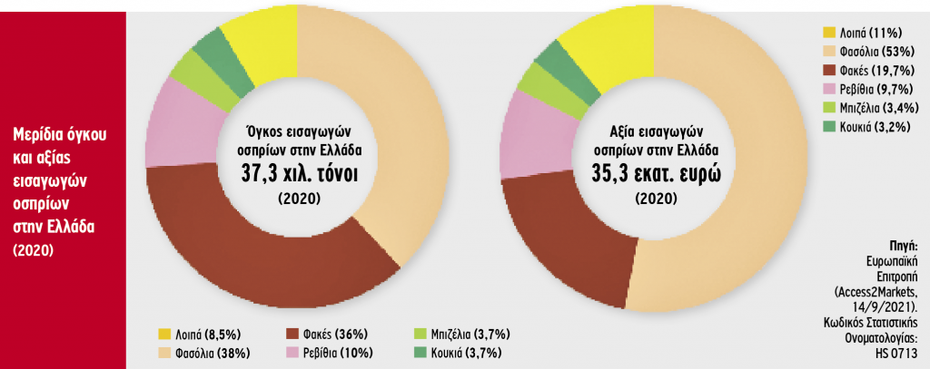 Το εμπορικό ισοζύγιο της χώρας στα ξερά όσπρια παραμένει αρνητικό επί σειρά ετών, μια και η εγχώρια αγορά κατακλύζεται από φθηνά εισαγόμενα προϊόντα, προερχόμενα κυρίως από τρίτες χώρες. Το 2020, οι εισαγωγές οσπρίων στην Ελλάδα ανήλθαν σε 37.300 τόνους, αξίας 35,3 εκατ. ευρώ, παρουσιάζοντας σημαντική αύξηση σε σχέση με το προηγούμενο έτος ως προς τον όγκο (+22%) και την αξία (+31%). Τα φασόλια εξακολουθούν να καλύπτουν το μεγαλύτερο μέρος του όγκου (38%) και της αξίας εισαγωγών (53%) και ακολουθούν οι φακές και τα ρεβίθια, ενώ μικρότερα μερίδια αντιστοιχούν στα άλλα προϊόντα.