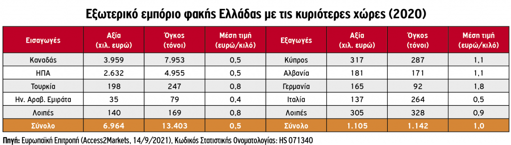 Το υπόλοιπο μέρος των αναγκών καλύπτεται από εισαγωγές (14.202 τόνοι, αξίας 18,7 εκατ. ευρώ το 2020), με κυριότερους προμηθευτές την Κίνα, τον Καναδά και την Αργεντινή, με μέση τιμή εισαγωγής (1,3 ευρώ/κιλό) που υπολείπεται σημαντικά εκείνης των εξαγωγών (1,6 ευρώ/κιλό).