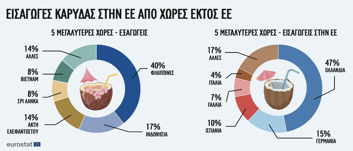 | Εισαγωγές καρύδας αξίας 146 εκατ. ευρώ σε χώρες της ΕΕΠρώτη στη λίστα των ενδιαφερόμενων η Ολλανδία Το 2023, τα κράτη-μέλη της ΕΕ εισήγαγαν 105.104 τόνους καρύδας από τρίτες χώρες, αξίας 146 εκατ. ευρώ. Τα δύο τρίτα (67%) αυτών των εισαγωγών ήταν αποξηραμένες καρύδες (70.330 τόνοι), ενώ το υπόλοιπο ένα τρίτο (33%) αποτελούνταν από νωπές καρύδες, είτε χωρίς κέλυφος ή χωρίς φλούδα (20.328 τόνοι), είτε με το εσωτερικό κέλυφος «ενδοκάρπιο» (14.447 τόνοι). Οι εισαγωγές καρύδας από χώρες εκτός της ΕΕ προήλθαν κυρίως από πέντε εταίρους, που αντιπροσωπεύουν το 86% του συνόλου των εισαγωγών καρύδας. Οι Φιλιππίνες ήταν μακράν ο μεγαλύτερος προμηθευτής, παρέχοντας 41.944 τόνους, οι οποίοι αντιπροσώπευαν το 40% των συνολικών εισαγωγών καρύδας εκτός ΕΕ. Ακολούθησαν η Ινδονησία (17.992 τόνοι, ήτοι 17%), η Ακτή Ελεφαντοστού (14.642 τόνοι, 14%), η Σρι Λάνκα (8.206 τόνοι, 8%) και το Βιετνάμ (8.065 τόνοι, 8%). Η Ολλανδία ξεχώρισε ως ο μεγαλύτερος εισαγωγέας καρύδας μεταξύ των χωρών της ΕΕ το 2023, εισάγοντας σχεδόν το μισό από αυτή την ποσότητα (48.937 τόνους ή το 47% του συνόλου των εισαγωγών καρύδας από χώρες εκτός ΕΕ). Η Γερμανία ήταν ο δεύτερος μεγαλύτερος εισαγωγέας, με 15.400 τόνους, αντιπροσωπεύοντας το 15% όλων των εισαγωγών καρύδας εκτός ΕΕ, ακολουθούμενη από την Ισπανία (10.743 τόνοι, 10%), τη Γαλλία (7.793 τόνοι, 7%) και την Ιταλία (4.643 τόνοι, 4%). |