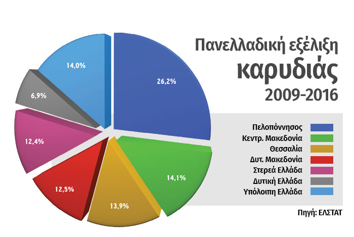 Ο Δημήτρης Συψής, τέταρτης γενιάς παραγωγός καρυδιού από την Ορεινή Πιάνα Αρκαδίας, είπε στην «ΥΧ»: «Φέτος, θα έχουμε μια πολύ καλή χρονιά. Η ανθοφορία εξελίσσεται πολύ καλά και δεν φαίνεται να υπάρχει κανένα πρόβλημα. Εκείνο που είναι δεδομένο είναι ότι υπάρχει μία αύξηση της καλλιέργειας καρυδιάς με νέες ποικιλίες, περισσότερο ανθεκτικές και αποδοτικές, όπως οι Φρακέτες (Franquette) και Τσάντλερ (Chandler)». Πρέπει να θεωρείται δεδομένο ότι τα επόμενα χρόνια θα έχει μειωθεί δραματικά η καλλιέργεια της παραδοσιακής καρυδιάς, της λεγόμενης και Βασιλικής.