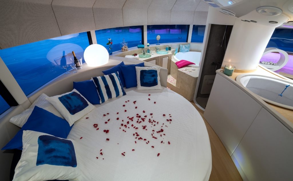Το Anthenea είναι μια πλήρως αυτόνομη σουίτα στο νερό, που διαθέτει μπαρ στον τελευταίο όροφο, σολάριουμ και κουζίνα με υποβρύχια θέα.