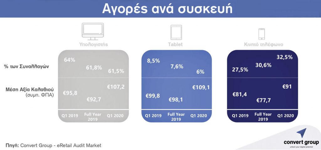 Από την ανάλυση της Convert Group, προκύπτει ότι ολοένα και περισσότεροι καταναλωτές προτιμούν να κάνουν τα ηλεκτρονικά τους ψώνια μέσω κινητού τηλεφώνου. Είναι χαρακτηριστικό ότι οι online αγορές μέσω κινητού αντιπροσώπευαν το 32,5% του συνόλου στο πρώτο τρίμηνο του 2020, όταν έναν χρόνο πριν το αντίστοιχο ποσοστό ήταν στο 27,5% και για το σύνολο του 2019 στο 30,6%. Αντίθετα, μειωμένες εμφανίζονται οι αγορές μέσω υπολογιστή, οι οποίες από 64% στο πρώτο τρίμηνο του 2019 και 61,8% για όλο το περυσινό έτος υποχώρησαν το πρώτο τρίμηνο του 2020 στο 61,5%. Πτωτικά κινήθηκαν και οι αγορές μέσω tablet, οι οποίες δεν ξεπέρασαν στο εξεταζόμενο διάστημα το 6% όταν έναν χρόνο πριν αντιπροσώπευαν το 8,5% και στο σύνολο του 2019 το 7,6% των διαδικτυακών συναλλαγών.