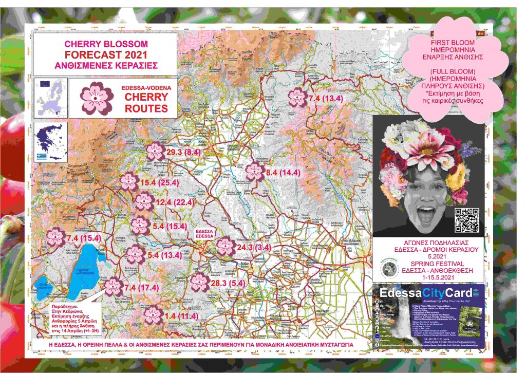 Περισσότερες πληροφορίες για τις ανθισμένες κερασιές και τα σημεία θέασης θα βρείτε στον χάρτη ανθοφορίας καθώς επίσης και στον δικτυακό τόπο της Έδεσσας www.edessacity.gr όπου μπορείτε να ενημερωθείτε για την Κάρτα Πόλης της Έδεσσας, την EdessaCityCard καθώς επίσης και να δηλώσετε ενδιαφέρον για την συμμετοχή στα προγράμματα των μαθητικών ψηφιακών εκδρομών της Έδεσσας. Η άνοιξη ήρθε, απολαύστε την πλάι στο λευκό λουλουδάκι της κερασιάς …