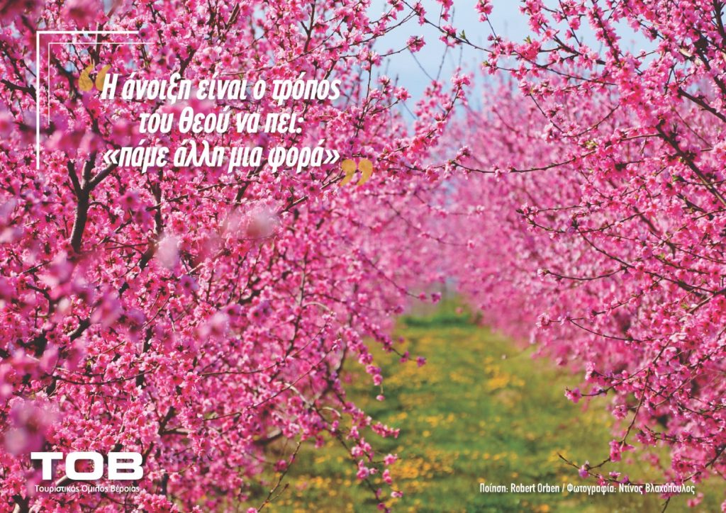 Σε μία χρονική περίοδο που η ζοφερή πραγματικότητα και τα δυσάρεστα γεγονότα περισσεύουν, η Βέροια έχει ένα μοναδικό προνόμιο να ζει κάθε άνοιξη τη δική της Αναγέννηση! Οι Ανθισμένες Ροδακινιές αψηφούν την πανδημία και καλωσορίζουν την Άνοιξη, στέλνοντας ένα αισιόδοξο μήνυμα προς όλους μας!
