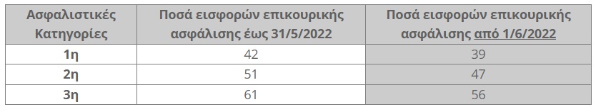 Σημειωτέον ότι από 1/1/2023 έως 31/12/2024 τα ποσά των εισφορών για κάθε κατηγορία στον Κλάδο Επικουρικής ασφάλισης θα προσαυξάνονται με διαπιστωτική πράξη του Υπουργού Εργασίας και Κοινωνικών Υποθέσεων, κατά το ποσοστό μεταβολής του μέσου ετήσιου γενικού δείκτη τιμών καταναλωτή του προηγούμενου έτους. Σε περίπτωση αρνητικής τιμής του ως άνω ποσοστού, το ποσό της εισφοράς θα παραμένει στα επίπεδα του προηγούμενου έτους.