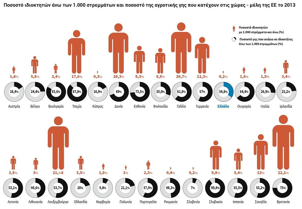 Η υψηλή αυτή συγκέντρωση δεν χαρακτηρίζει μόνο την Ελλάδα, αλλά αποτελεί, πλέον, πανευρωπαϊκό φαινόμενο. Όπως απεικονίζεται στο σχετικό διάγραμμα, οι ανισότητες στην κατοχή αγροτικών εκτάσεων διαφέρουν σημαντικά μεταξύ των χωρών-μελών. Κατά κανόνα, οι παλαιότερες χώρες της ΕΕ, όπως το Βέλγιο, η Ολλανδία, η Ιρλανδία, εμφανίζουν μία ομαλή κατανομή. Στο άλλο άκρο, βρίσκονται νέες χώρες- μέλη, όπως η Ουγγαρία, η Βουλγαρία, η Ρουμανία, όπου ένα πολύ μικρό ποσοστό ιδιοκτητών, περίπου 0,5%-2%, κατέχει το 48,3% έως 83,6% των αγροτικών εκτάσεων.