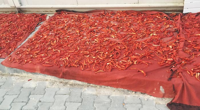 Δεκάδες χιλιόμετρα πιο μακριά, στην πόλη Κίλις, που βρίσκεται στα νοτιοκεντρικά της Τουρκίας κοντά στα σύνορα με τη Συρία, οι παραγωγοί μόλις έναν μήνα πριν έστρωσαν έναν ολόκληρο δρόμο με καυτερές πιπεριές για να τις αποξηράνουν. Στη συνέχεια, τις διοχέτευσαν στα τοπικά εργοστάσια για επεξεργασία. Εννοείται πως το 70%-80% των εδεσμάτων στην Τουρκία έχει προσθήκη πιπεριού σε μικρή ή μεγάλη αναλογία. Ακόμα και στον προσφυγικό καταυλισμό της πόλης, οι περίφημες καυτερές πιπεριές έχουν στρωθεί για αποξήρανση.