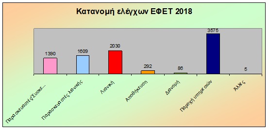 Συγκεκριμένα, κατά το έτος 2018, οι επιθεωρητές του ΕΦΕΤ πραγματοποίησαν 8.987 ελέγχους σε όλες τις κατηγορίες επιχειρήσεων τροφίμων, με συχνότητα που υπαγορεύεται, κατά βάση, από ανάλυση της επικινδυνότητας.