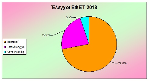 Οι τακτικοί έλεγχοι – 6472 ανήλθαν στο 72% των διενεργηθέντων ελέγχων, οι επανέλεγχοι – 2052 ανήλθαν στο 22,8% και η διαχείριση έκτακτων περιστατικών – 463 ανήλθε στο 5,2%.