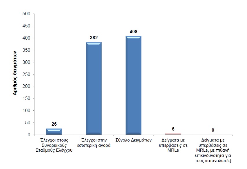 Σύμφωνα με τη Διεύθυνση Προστασίας Φυτικής Παραγωγής του ΥΠΑΑΤ που διεξήγαγε τους ελέγχους τόσο σε συνορικούς σταθμούς όσο στην εσωτερική αγορά, τον μήνα Ιούνιο από συνολικά 408 δείγματα δεν εντοπίσθηκαν σε φυτικά προϊόντα υπερβάσεις σε MRLs (υπολείματα φυτοφαρμάκων), με πιθανή επικινδυνότητα για τους καταναλωτές.