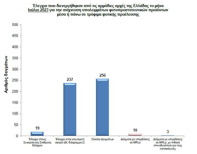 Τον μήνα Ιούλιο όμως σε σύνολο 256 δειγμάτων εντοπίσθηκαν 3 περιπτώσεις τροφίμων με υπερβάσεις σε MRLs (υπολείματα φυτοφαρμάκων), με πιθανή επικινδυνότητα για τους καταναλωτές