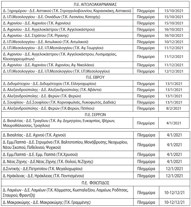 Οι οριοθετημένες περιοχές, για την επιχορήγηση αγροτικών εκμεταλλεύσεων του ν. 4797/2021 (Α’ 66), για την αντιμετώπιση ζημιών από θεομηνίες και ειδικότερα από πλημμύρες 4.1.2021 στην Π.Ε. Σερρών, πλημμύρες 11-12.1.2021 και 1.2.2021 στην Π.Ε. Έβρου, πλημμύρα 11.12.2021 στην Π.Ε. Φθιώτιδος, καθώς και πλημμύρες 15-16.10.2021 και 11-12.12.2021 στην Π.Ε. Αιτωλοακαρνανίας, όπως αναλυτικά αναφέρονται στα σχετικά φύλλα της Εφημερίδας της Κυβέρνησης και στον Πίνακα που ακολουθεί, εντάσσονται στην παρούσα απόφαση ως επιλέξιμες, για την αντιστάθμιση ζημιών φυτικού κεφαλαίου και μόνο, εφόσον υποβληθούν σχετικές αιτήσεις χορήγησης ενίσχυσης, στο πλαίσιομε της ανακοίνωσης του προγράμματος, μετά από βεβαίωση της αρμόδιας Περιφέρειας ότι δεν καταγράφηκαν οι
