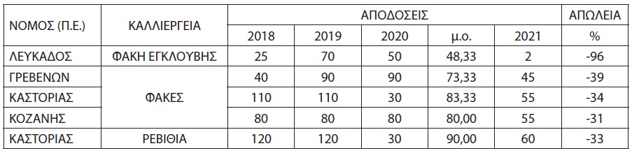 Εντάσσονται, ως επιλέξιμες ενίσχυσης απώλειας παραγωγής, οι καλλιέργειες των Περιφερειακών Ενοτήτων Γρεβενών, Καστοριάς, Κοζάνης και Λευκάδας σύμφωνα