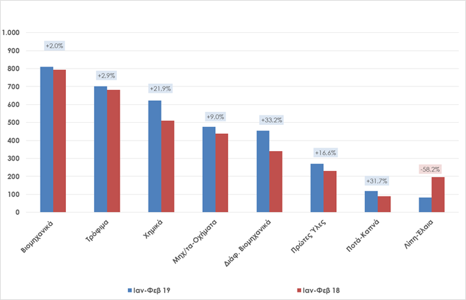 Αναφορικά με τις εξαγωγικές μας επιδόσεις ανά κλάδο για το πρώτο δίμηνο του 2019, τα λίπη και έλαια παρουσίασαν σημαντική μείωση κατά €114,2 εκατ., δηλαδή 58,2%, ενώ οι υπόλοιποι κλάδοι παρουσίασαν αυξητική τάση με τη μεγαλύτερη θετική μεταβολή να σημειώνουν τα χημικά (€111,7 εκατ., ήτοι 21,9%) και τα διάφορα βιομηχανικά είδη (€113,5 εκατ., ήτοι 33,2%). Αναλυτικά, οι εξαγωγές βιομηχανικών προϊόντων αυξήθηκαν κατά €15,8 εκατ., δηλαδή 2,0%, τα τρόφιμα κατά €19,6 εκατ., δηλαδή 2,9%, τα μηχανήματα και οχήματα κατά €39,3 εκατ., δηλαδή 9,0%, οι πρώτες ύλες κατά €38,3 εκατ., δηλαδή 16,6% και τα ποτά και καπνά κατά €28,7 εκατ., δηλαδή 31,7%.