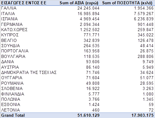 Ακολουθούν οι συγκεντρωτικοί πίνακες ενδοκοινοτικών αποκτήσεων και εισαγωγών ελληνικού οίνου:
