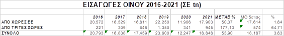 Αύξηση καταγράφουν οι εισαγωγές οίνου το 2021 τόσο σε ποσότητα, όσο και σε αξία, αποτέλεσμα προφανώς των επιπτώσεων της πανδημίας κατά τη διάρκεια του 2020. Ωστόσο αυξημένες καταγράφονται οι εισαγωγές οίνων συγκρινόμενες με το 2019 ως προς την αξία κατά 9,93%, ενώ σε ποσότητες εμφανίζονται μειωμένες κατά 19,53%.