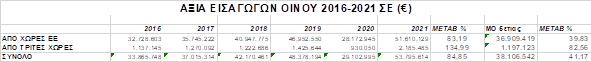 Οι εισαγωγές οίνου αφορούν κυρίως ενδοκοινοτικές αποκτήσεις, δηλαδή από χώρες της Ε.Ε. από την οποία οι αποστολές αυξήθηκαν κατά 83,19% σε αξία (28.172.945 €/2020 – 51.610.129 €/2021), ενώ αύξηση κατά 39,83% παρουσιάζει και η σύγκριση των μεγεθών σε αξία του 2021, με το μέσο όρο της προηγούμενης 5ετίας 2016 – 2020.