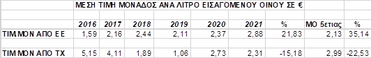 Η μέση τιμή αγοράς οίνων από χώρες της Ε.Ε. ανά kg, αυξήθηκε με βάση το 2021 κατά 21,83% (2,37 €/kg/2020 – 2,88 €/kg/2021).