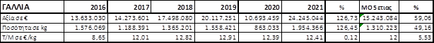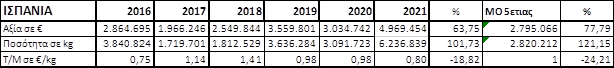 Σύμφωνα με τους ανωτέρω πίνακες σε συνολικό επίπεδο το 2021 καταγράφεται αύξηση της αξίας εισαγωγών έναντι του 2020 κατά 84,85% (29.102.995 €/2020 – 53.795.614 €/2021), όταν οι εισαγωγές του 2020 είχαν σημειώσει μείωση κατά 39,84% έναντι του 2019.