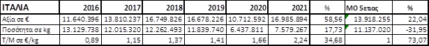 Ισοδύναμη αυτών των μεταβολών είναι η αύξηση της μέσης τιμής αγοράς οίνων από Ιταλία κατά 34,68% (2,24 €/kg/2021 – 1,66 €/kg/2020), τιμή που είναι αυξημένη σε σχέση με το επίπεδο των προηγούμενων 5 ετών, κατά 73,07%.