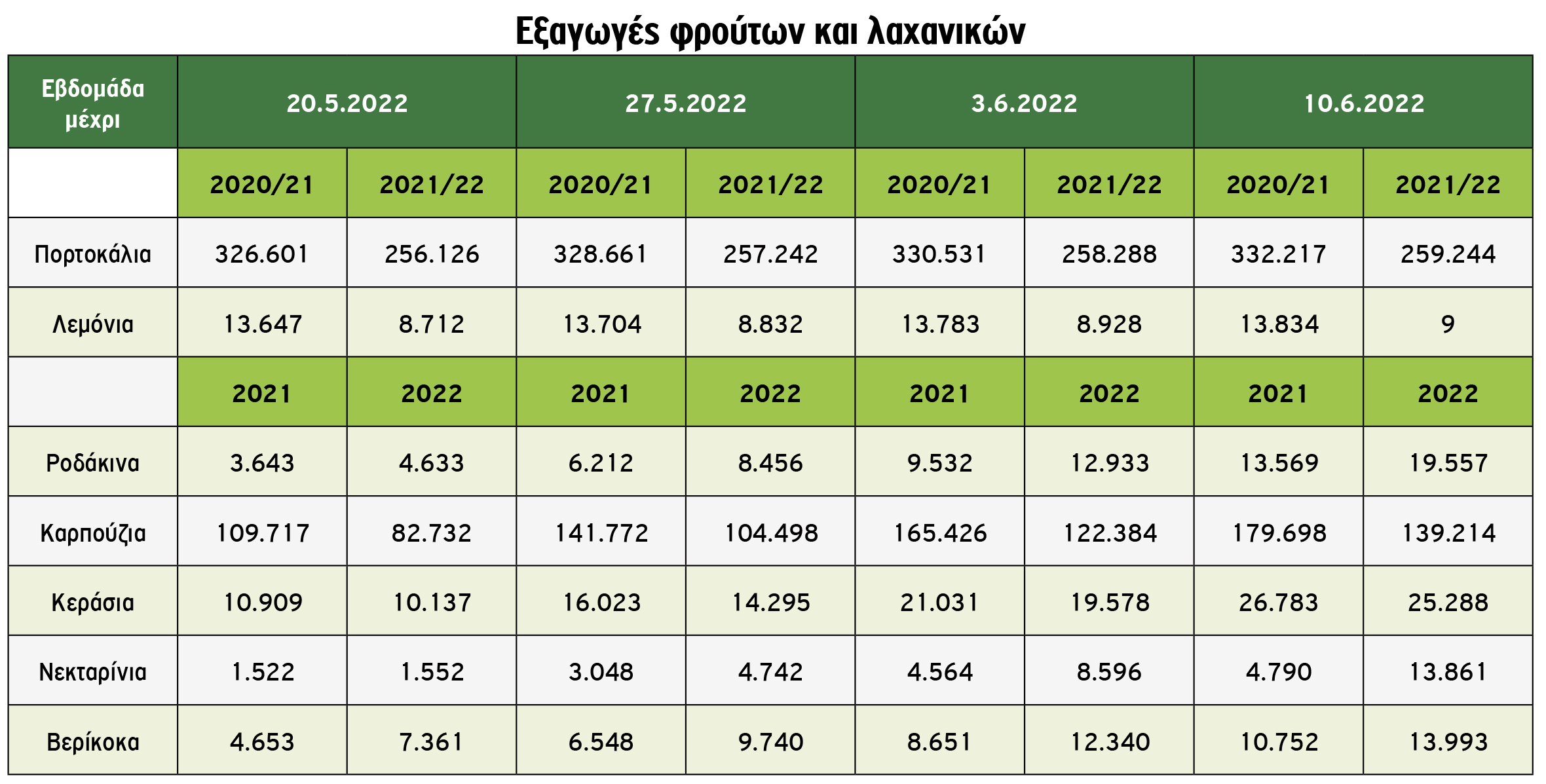 Eιδικότερα, οι εξαγωγές των βερίκοκων μέχρι τις 8 Ιουλίου 2022 είναι αυξημένες κατά +30.1% σε σχέση με την αντίστοιχη περίοδο του 2021 ανερχόμενες σε 13.993 τόνους (-16,7% σε σχέση με 2020), των ροδακίνων κατά + 44,1% (-47,4% σε σχέση με 2020), των νεκταρινιών κατά + 189% (-38,2% σε σχέση με 2020). Αντίθετα, μειωμένες είναι οι εξαγωγές των κερασιών κατά -5,6% (-13,1% σε σχέση με 2020), καρπουζιών κατά -22,5% στους 139.214 (-18,3% σε σχέση με 2020) τόνους.